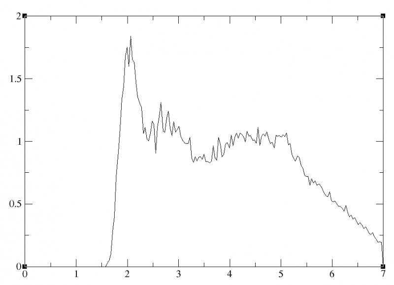 这看起来基本是正常的,假如你计算rdf的程序没有问题的话。 你的立方体盒子边长只有10,由于周期性边界条件,符合rdf计算程序归一化条件的区域在r<10/2=5.0的区域内,所以可以看到在小于5.5的时候rdf值是接近1 的(rdf值在无穷远处会趋近于1)。当5.50< r < sqrt(2)*5.5时,这时可看做是统计边长为10的立方盒子砍去一个半径为5的内切球的剩余边角区域内的粒子,通常rdf计算程序在这一部分区域内的归一化会失效,所以你的rdf在5到7之间会从1掉到0. 一般r大于盒子边长一半的情况下rdf是没有太大意义的,画图时不必画出。 |