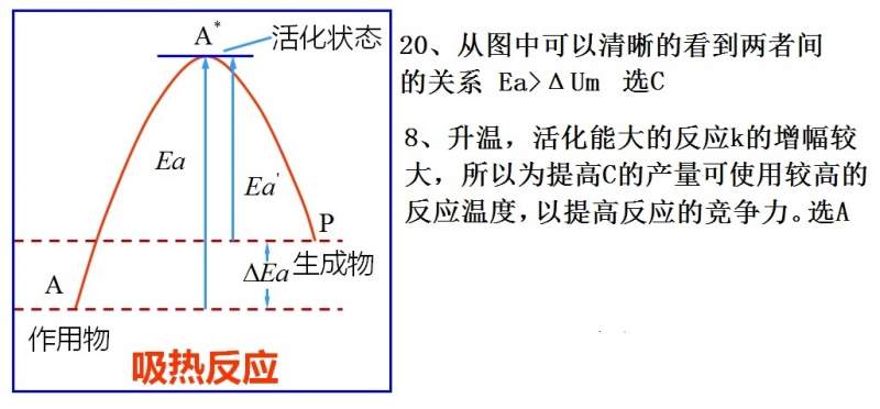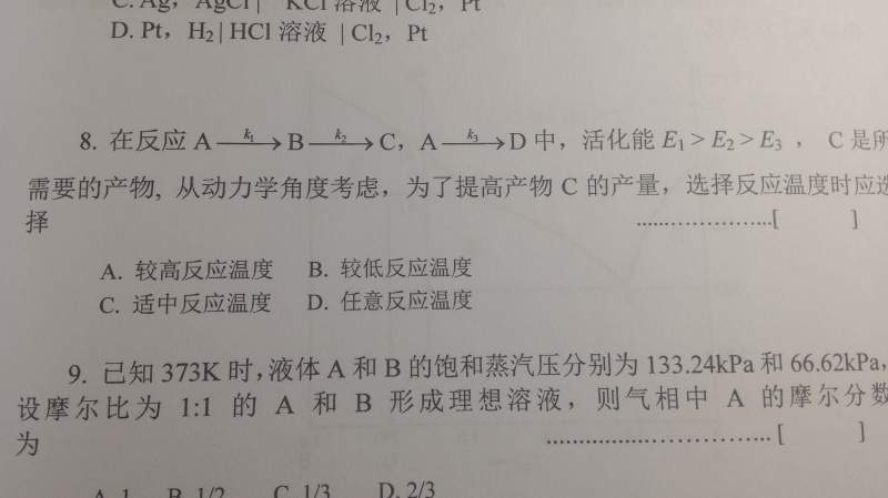 第8题,因为k1>k2.所以当升高T时,反应会向着ABC的方向进行,A到D就成了微弱的副反应。 发自小木虫Android客户端 |
