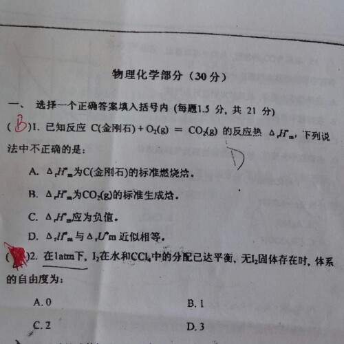 1、选B。A符合燃烧热的定义;B不符合由最稳定单质生成1mol该物质,C元素的最稳定单质是石墨;C燃烧是放热反应;DΔrHm=ΔrUm+RTΣν(g),因反应前后气体分子数不变,即Σν(g)=0,所以ΔrHm=ΔrUm