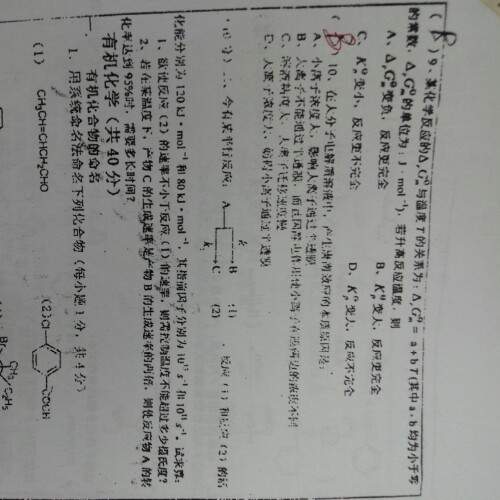 我说下第9题吧!解答题看不太清楚,温度升高,标准摩尔的吉布斯变小,那么平衡常数变大,也就是升温平衡常数变大,然后套用,那些基于压力,基于物质的量等的平衡常数与标准平衡常数的关系,应该就出来了吧!那些符号打不出来,不知道这么表达可以么?哈哈。 发自小木虫Android客户端 |