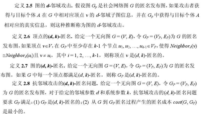 定义 2.8 抗领域攻击的(d,k)-匿名问题。 给定一个无向图G=(V,E),令Gp=(Vp,Ep)为G