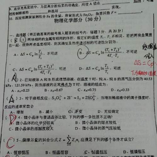 2、正常沸点,指明系统所处的压力为101.325kPa,设液体混合物的液相中A的组成为x(A),列方程:40.53x(A)+121.59(1-x(A))=101.325,解得:x(A)=0.25 选A。