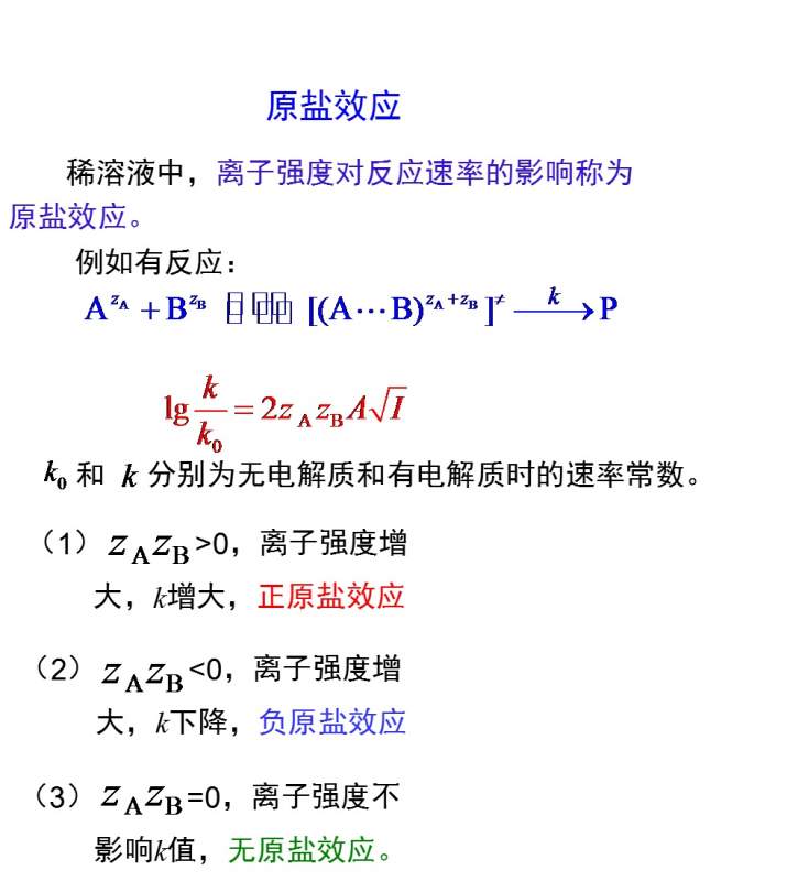 一个正离子与一个负离子反应,应ZaZb<0,离子强度增大,速率系数减少。称为负原盐效应。