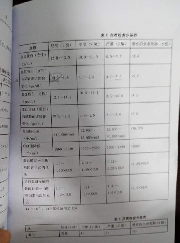 附图为预防用疫苗临床试验不良反应分级标准指导原则中的血液检查分级表,前两行一直看不懂; 1、在实验室指标中,血红蛋白的正常值范围为110-150g/L,可是按照以上表格的分级,110g/L就已经算是一级不良反应, 这有什么冲突吗?或者是否是两者的标准不一样。 2、第二行的“增长”一直弄不懂是与什么值相比较的增长。 两个问题都求解答。 P51105-165514.jpg |
