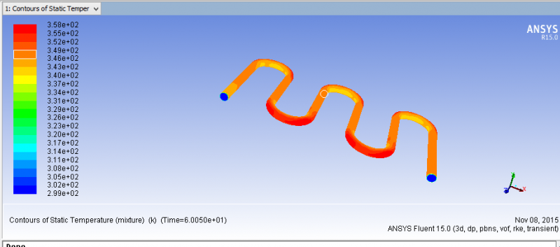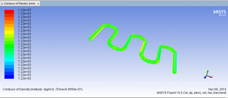画了一个蛇形管,管外均匀热流加热,工质为R141B,进口处有8.5度过冷度,经过蛇形管,汽化,管内为两相流,可是我计算了6000多步了,管内密度还是没有变化,管内温度变化也很小,请教各位大神,这是怎么回事??哪里设置错了? 密度分布图.png 温度分布图.png |