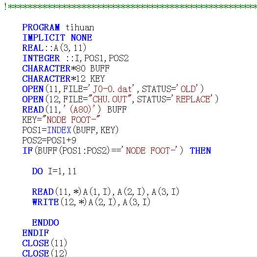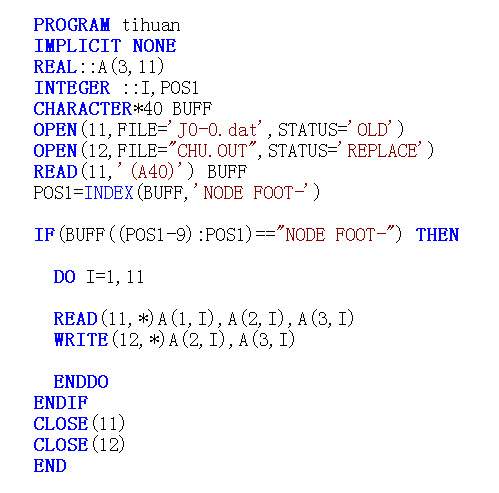 请教:如果dat文件中有“NODE FOOT-”字符串,我想用fortran程序查找到它,应该怎么写呢? 我这样写好像不行 CHARACTER*80 BUFF READ(11,*) BUFF IF(BUFF=="NODE FOOT_" THEN主要是字符间存在空格,请问怎么办 |