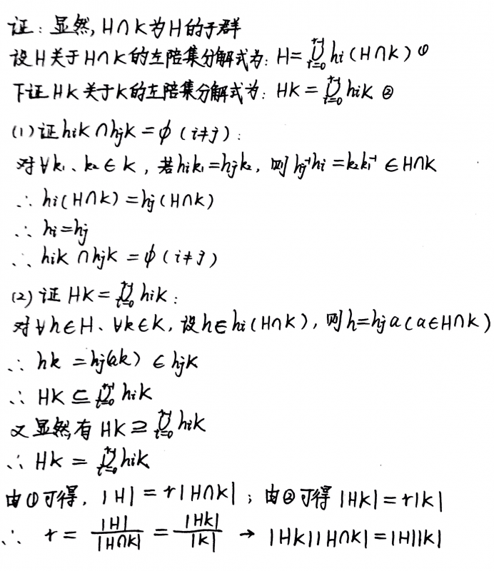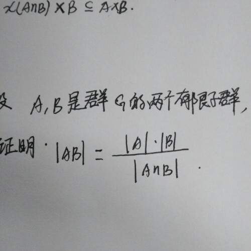 A和B都可以表示为A交B的陪集的并 所以,设A交B为M 则 A=a1M U a2M U ....U apM B=Mb1 U Mb2 U ....U Mbq 其中aiM和ajM交集为空;Mbi和Mbj交集为空 |A|=p*|M| |B|=q*|M| A*B=(a1M U a2M U ....U apM)*(Mb1 U Mb2 U ....U Mbq)=A*(Mb1 U Mb2 U ....U Mbq) =AMb1 U AMb2 U ....U AMbq=Ab1 U Ab2 U ....U Abq=|A|*q=p*q*|M| 所以得证 |