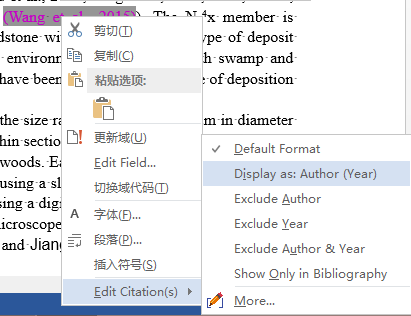 方法一:在文档中选择你想要更改的参考文献引用,右键菜单里选择“edit citation(s)”--"display as : author (year)"; 方法二:在文档中引用参考文献时,引用文献的窗口下方有一个“insert”按钮,选择第二个选项,“insert & display as: author (year)” ![]() ![]() |
