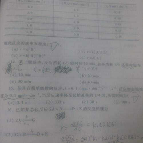 15题:通过速率系数可知为二级反应。r1/r2=(C1/C2)^2=4,则C2=0.5C1,即为半衰期t1/2=1/(kCa0)=100s