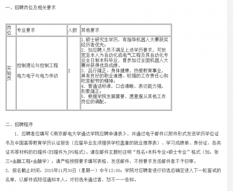 南京邮电大学通达学院招聘教师、实验员18名。 详情请登录学院网站:https://42.121.144.20/,点击“人才招聘”,按要求发送简历,谢谢合作! 教师专业要求.png 实验员专业要求.png |