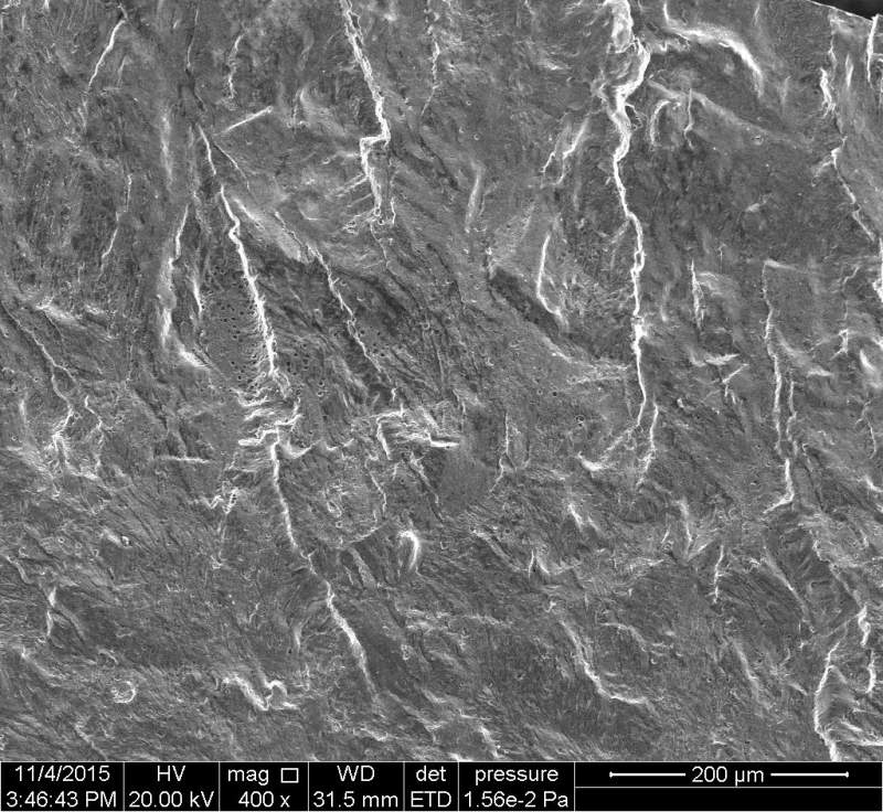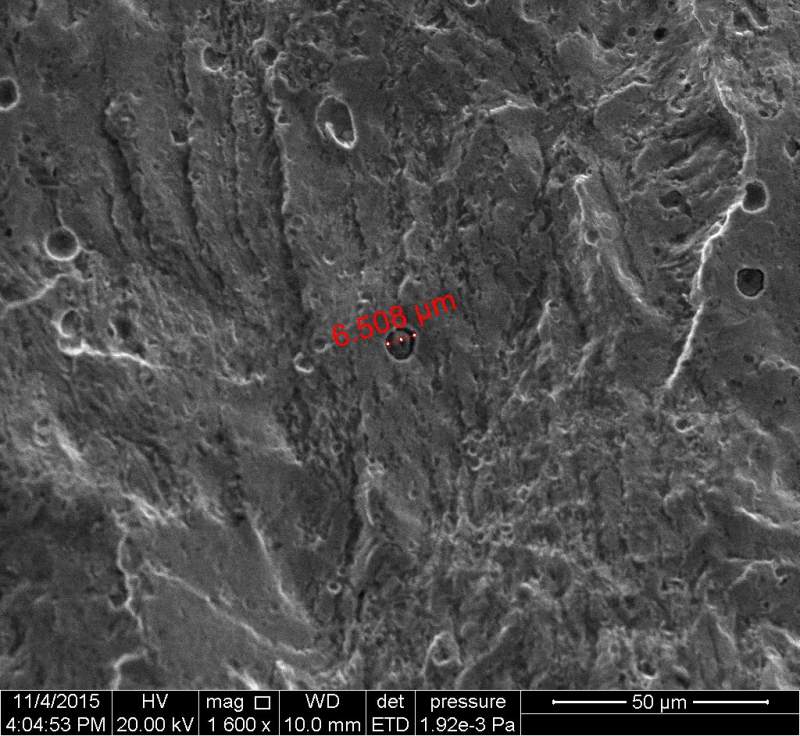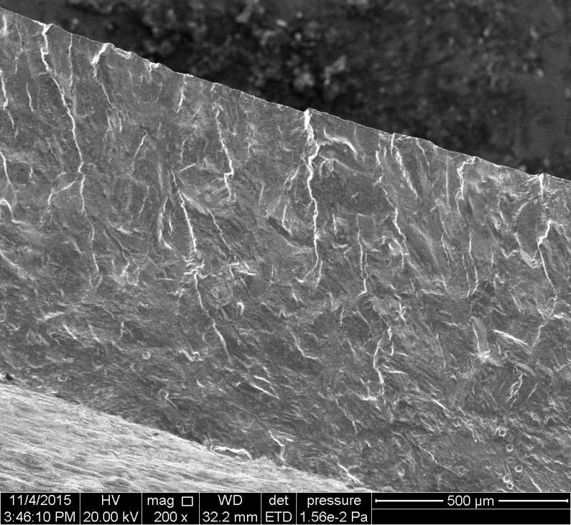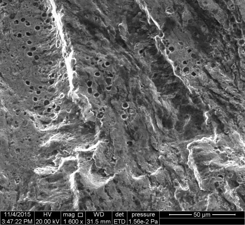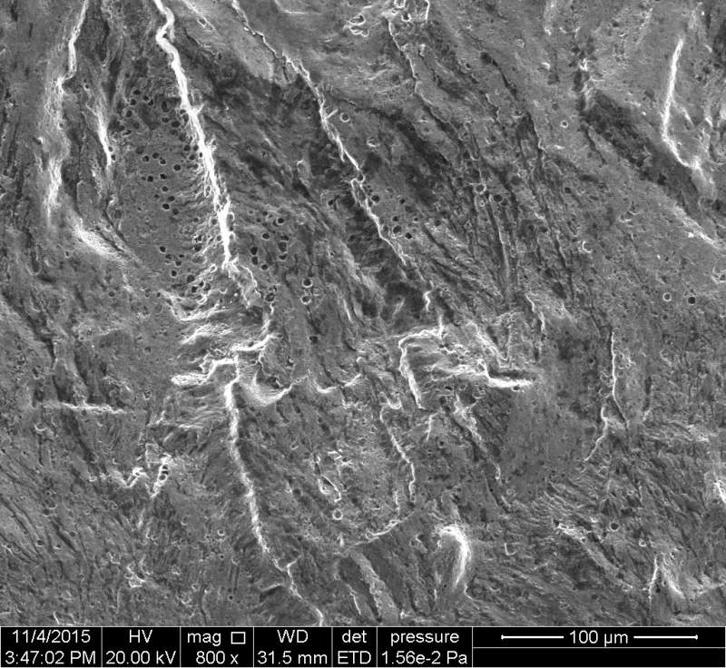 304不锈钢材料,经过冲压加工后,局部位置材料厚度变薄30%左右。 该材料在振动10小时后,在变薄位置处发生断裂。 断口宏观上看:为本体材料的颜色 扫描电镜照片如下,请大家帮看看这个断口属于什么性质的断裂? 扫描照片中出现的孔是原材料本身就存在还是断裂后形成?谢谢 200X 400X 800X 1600X 1600X |