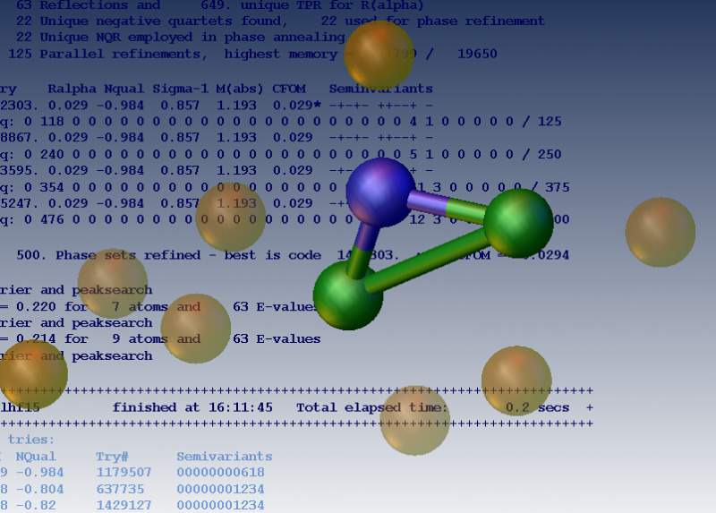 如题。新学olex2软件,solve以后的截图如下: 一个锌原子,两个氯原子,其他的都是Q峰,如何往下解析哦?不成形了,把Q峰弄成C吗?请大侠指点一二,谢谢。 已经学习单晶解析几年,或是自己的努力不够,数据好的,解析容易,不好的就会在一开始成型以前犯怵,请指点指点吧。谢谢! 1.jpg |