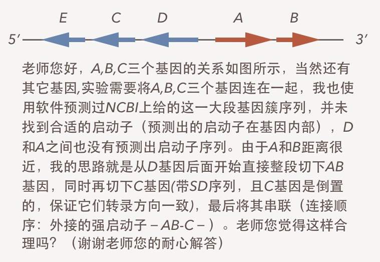 谢谢老师!我做的的确是放线菌,而且是在原始菌株中表达,但我还是有不明白的地方,因为C基因它的表达方向和A,B的不一样(基因簇上面的箭头方向是相反的),当把C基因与A,B串联在一起的时候,我应该需要"倒着"去将C基因与A,B连接上吧?此外这三个基因共用一个启动子。 图片A的核糖体结合位点:ggagg 图片B的核糖体结合位点应该是aggaga吧 图片C的核糖体结合位点是什么呢?(C基因的转录表达方向是相反的,反着看序列,发现不好确定,是第19位的ggag吗?) 因为这三个基因里A,B是挨着的,我准备把它们都PCR出来连接在T载体上,再将3个串联基因酶切下来,导入整合型质粒,最终导入链霉菌中。这样做应该可行。 |