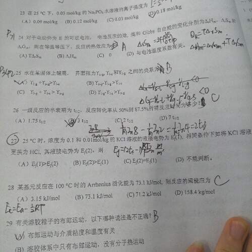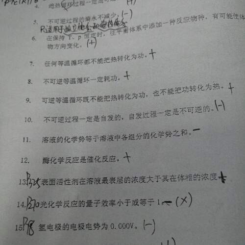 7、正确。因等温循环,系统复原,若热转化为功,必然是100%的转化,根据热功转化的不可逆性,这个过程是不能进行的。 8、正确。不可逆的等温循环,系统复原,若此过程能够进行,根据热功转化的不可逆性,必定是有一定的功转化为热。 9、正确,因等温可逆循环,系统复原,环境也复原,环境与系统间交换的Q=0,W=0,自然不存在功转化为热的情况。 10、错误。化学势只对某一种物质而言,溶液是混合物,故不存在混合物的化学势之说。 27、选B。因H+的迁移速率很大,即同浓度的KCl和HCl,H+的迁移数大于K+的迁移数。 |