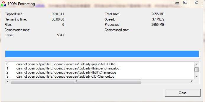 小弟第一次使用opencv,在官网上下载后,点安装节开始extract文件,最后却提示有5000+个错误,提示can not open output file...这到底是怎么回事啊,按了好几次都这样,求高手解答。。。金币都相送,虽然不多.。。先在此谢过了。。。 最后安装出错提示.JPG 提取出来的文件,是不是不全?.JPG |