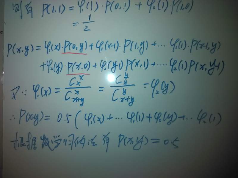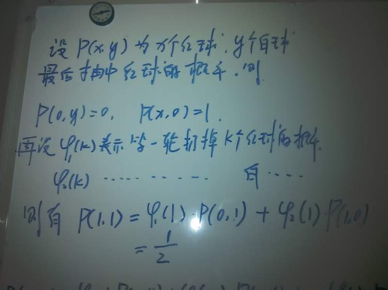 题目:一个袋子里有a个红球和b个白球,现用如下方法摸球 1)先摸一个球记下颜色并扔掉(2)再摸一个球,如果此球与上一球同色,则扔掉,并重复第(2)步;如果不同色,则放回,并回到第(1)步…求证摸出的最后一个球是红球的概率为1/2 |
