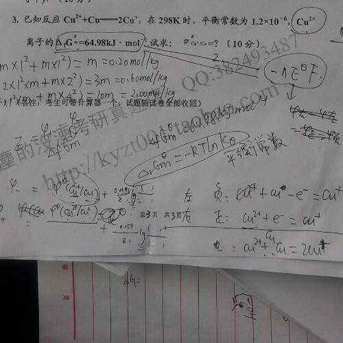(1)由平衡常数计算反应的标准吉布斯自由能变化量: ΔrG°m=-RTlnK°=33777J/K.mol (2)计算Cu+(aq)的离子摩尔吉布斯生成自由能: ΔrG°m=ΣνΔfG°m=2*ΔfG°m(Cu+)-ΔfG°m(Cu2+) 所以ΔfG°m(Cu+)=0.5*(33777+64980)=49378J/K.mol (3)Cu+(aq)的离子摩尔吉布斯生成自由能对应的方程:Cu-e-=Cu+ 与标准氢电极组成的电池(转移1mol电子)时的吉布斯自由能变化量: ΔrG°m=ΔfG°m(Cu+)=49378J/K.mol (4)j计算φ(Cu+/Cu)=-ΔrG°m/zF=0.512V |