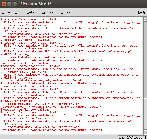 楼主,我也在学习分子对接,好不容易走到autodock这一步,但是dlg文件又打不开,出现下面的问题,看了半天不知所云。望楼主指点一下。另外,我的系统是32位win7。 IDLE 1.2.2 ==== No Subprocess ==== >>> exception in _buildInputLig ERROR ********************************************* Traceback (most recent call last): File "C:\Program Files\MGLTools-1.5.6\lib\site-packages\ViewerFramework\VF.py", line 898, in tryto result = command( *args, **kw ) File "C:\Program Files\MGLTools-1.5.6\lib\site-packages\AutoDockTools\autoanalyzeCommands.py", line 3852, in doit d.readDlg(dlgFile) File "C:\Program Files\MGLTools-1.5.6\lib\site-packages\AutoDockTools\Docking.py", line 105, in readDlg self.ch = ConformationHandler(self.ligMol, AttributeError: Docking instance has no attribute 'ligMol' Exception in Tkinter callback Traceback (most recent call last): File "C:\Program Files\MGLTools-1.5.6\lib\lib-tk\Tkinter.py", line 1403, in __call__ return self.func(*args) File "C:\Program Files\MGLTools-1.5.6\lib\site-packages\AutoDockTools\autoanalyzeCommands.py", line 5482, in guiCallback if hasattr(d.ligMol, 'vina_energy'): AttributeError: Docking instance has no attribute 'ligMol' |