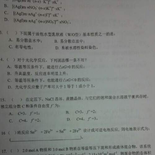 14、选C,组分数=3,相数=2 f=3-2+3=4 后面+3 表示有一个温度,2个压力