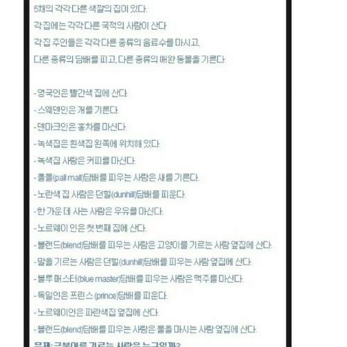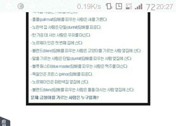 有5个不同颜色的房间;每个房间里分别住着不同国籍的人;每个人都喝不同的饮料,抽不同的烟,养不一样的宠物。 1、英国人住在红房子里。 2、瑞典人养狗。 3、丹麦人喝红茶。 4、绿房子紧挨着白房子,在白房子的左边。 5、绿房子的主人喝咖啡。 6、抽PALL MALL牌香烟的人养鸟。 7、黄房子里的人抽DUNHILL牌的烟。 8、住中间房子的人喝牛奶。 9、挪威人住在第一个房子里。 10、抽BLENDS香烟的人和养猫的人相邻。 11、养马的人和抽DUNHILL牌香烟的人相邻。 12、抽BLUEMASTER牌香烟的人喝啤酒 13、德国人抽PRINCE牌香烟。 14、挪威人和住蓝房子的人相邻。 15、抽BLENDS牌香烟和喝矿泉水的人相邻。 |
