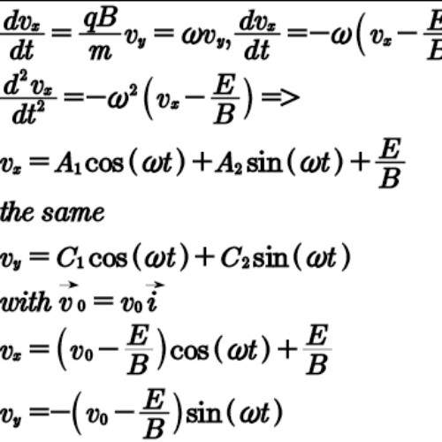以水平向右,竖直向下,垂直指向纸下为x,y,z正方向建立运动方程,得出a_x=w*v_y,a_y=-w*(v_x-E/B),再对这两式求时间t的导数,得到结果v_x=(v_0-E/B)cos(w*t)+E/B,v_y=-(v_0-E/B)sin(w*t),w=qB/m 发自小木虫Android客户端 |