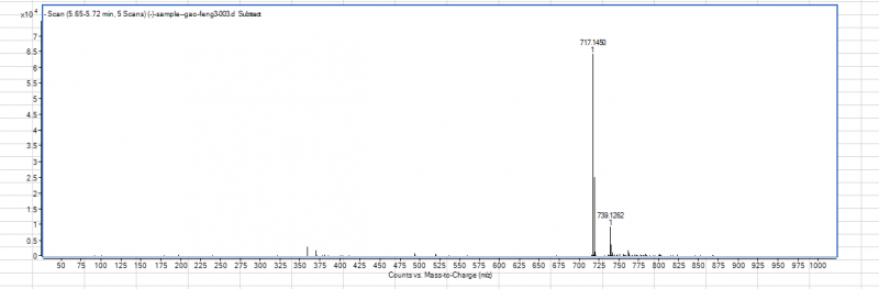 这个图已经非常清晰了 负离子[M-H]- m/z717,可以初步认为分子量是718,没有杂质,非常清晰是你的目标峰,至于m/z 739,应该是M+Na-2H的峰,你的化合物非常容易+Na 你用的如果是高分辨,是安捷伦6210类似系列的TOF MS吧,如果是这样,并对结果又怀疑再在做正离子模式,你会看到很多加Na的峰,加一个两个的。如果是QTOF,就再做MS/MS确定碎片。 TOF没法做MS/MS,不过也有办法做出碎片来,(*^__^*) 嘻嘻…… 化合物如果做鉴定未知结构,还要核磁的靠谱。质谱可以帮确定结构。 |