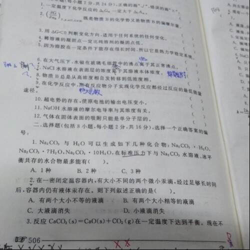 2、选D。根据开尔文公式可知,大液滴的饱和蒸气压小于小液滴的饱和蒸气压,而同一系统达平衡时只能有一个蒸汽压,故小液滴不断挥发气化,在大液滴上不断凝结,直至小液滴完全消失。