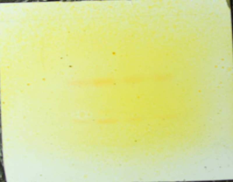 我在浙贝母薄层鉴别中喷过稀碘化必钾试液后,薄层板显橙色但条带看不清,请问是怎么回事,该如何解决?稀碘化铋钾配方如下:取市售碘化铋钾试剂2g,加冰乙酸20mL溶解后加50mL水稀释即可。在使用过程中经常有沉淀析出,显色后还不好看,不稳定 图片1.jpg |