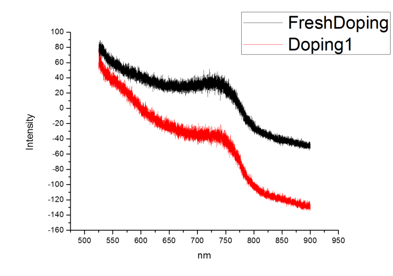 1. 这种样品的光谱应该是什么样的?两侧基线不一样高的光谱也有很多,首先要知道真实光谱形状。如果形状本应如此,只是计数出现负值,一般是仪器扣除背景计数的过程出现异常。这种情况可能是shutter在测试开始前不能正常关闭。 2. 你的设备有没有测过这个波段的光谱?之前是否正常?如果以前一切正常,则应该考虑探测器(CCD或PMT等)可能出现故障,导致近红外波段的光电转换效率发生明显下降。 3. 如果这是你的光谱仪第一次测这个波段,则需要查看光谱仪的光栅和探测器参数,看看这些部件在>750nm范围的响应度如何。有可能它们本来在这个波段的响应就很弱。 |