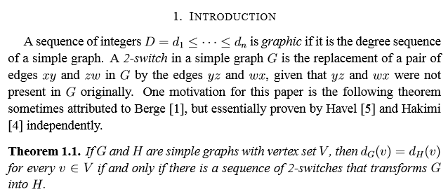 @Edstrayer 刚发完帖子,发现居然把 Edstrayer 准版主大神 的名字拼错了,非常非常对不起啊,敬请谅解。 另外,关于2-switch, 可以参考文章 http://homepages.math.uic.edu/~mubayi/papers/newdraft.pdf http://compalg.inf.elte.hu/~tony/Oktatas/TDK/FINAL/Chap%202.PDF |