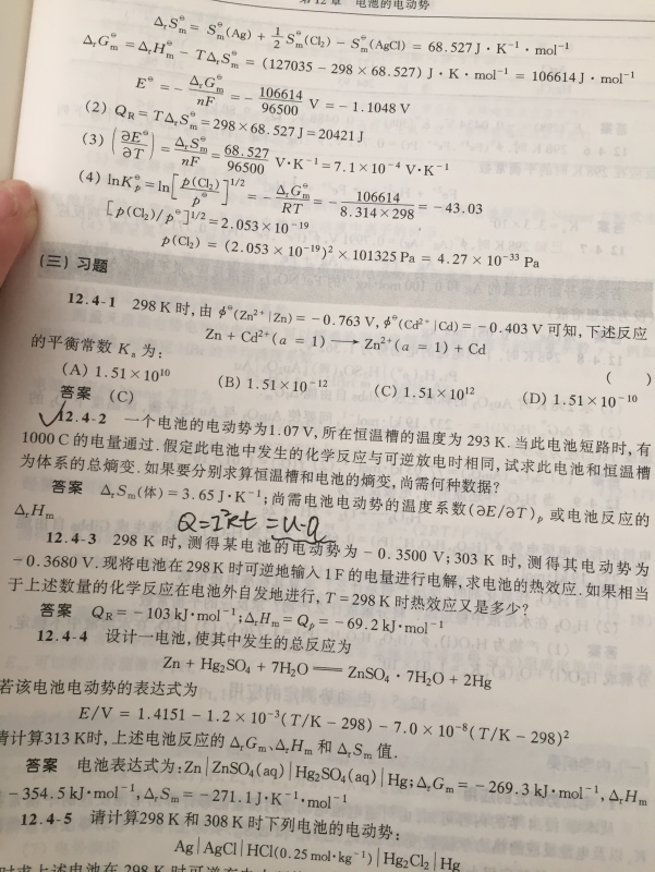 由于电池短路,在1.07V电动势下,传输1000C的电量的电能转化为了热,即Q=W=1.07*1000=1070J。若通过化学反应达到相同的终态,电池也将放出1070J。 ΔS(电池+恒温槽)=Qr/T=1070/298=3.65J/K. 若计算ΔS(电池)=zF(dE/dT)p 因此尚需提供电池的温度系数 也可以通过ΔS(电池)=(ΔH-ΔG)/T 因此尚需提供ΔH,ΔG可通过已知数据计算获得。 |