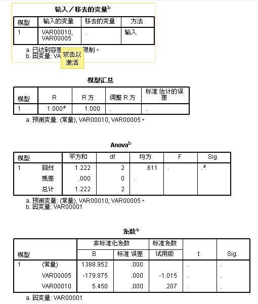 我的数据有限,只有三组,Y是因变量有9个自变量,我想做个回归方程找出两三个对Y值影响最大的自变量,路过的虫友们帮我看看该怎么做得出的结果准确有说服力些?用SPSS还是origin,在回归之前是不是要标准化处理一下?我之前用SPSS数据-回归-线性-得到的结果如图,R为1而且没有F值,不知道什么意思,请各位大侠帮帮忙给点建议具体该怎么做呢?![]() ![]() 捕获.PNG 捕获1.PNG |