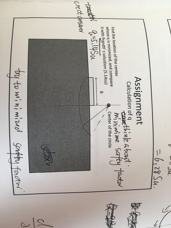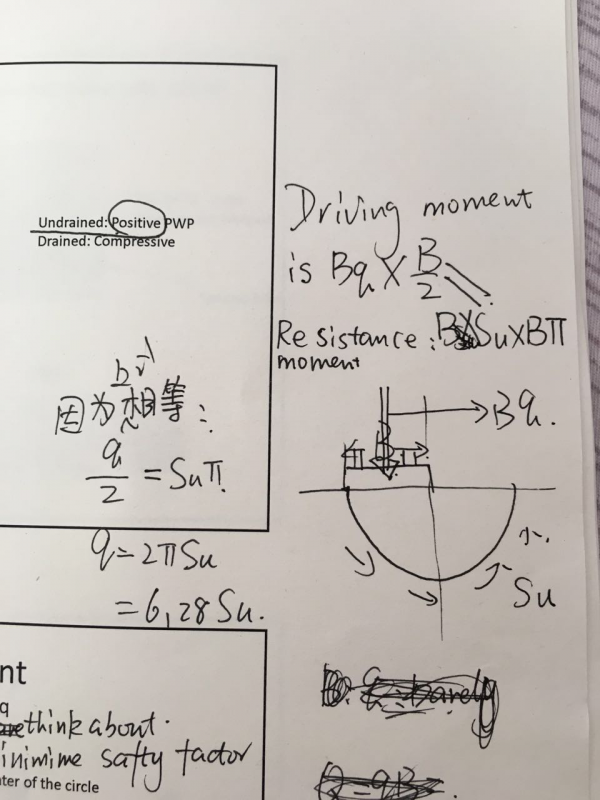 小弟现在在日本留学,选了外专业的课程,作业实在不理解,求大神指点 土力学,移动圆心的高度,求出q=A*Su这个关系中A的最小值,和普朗克公式q=5.14Su比较大小 q是B上的压强大小 Su是分布在圆弧上的剪切力 求大神帮忙解答下,小弟不胜感激哦 发自小木虫IOS客户端 |