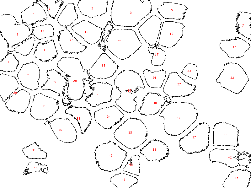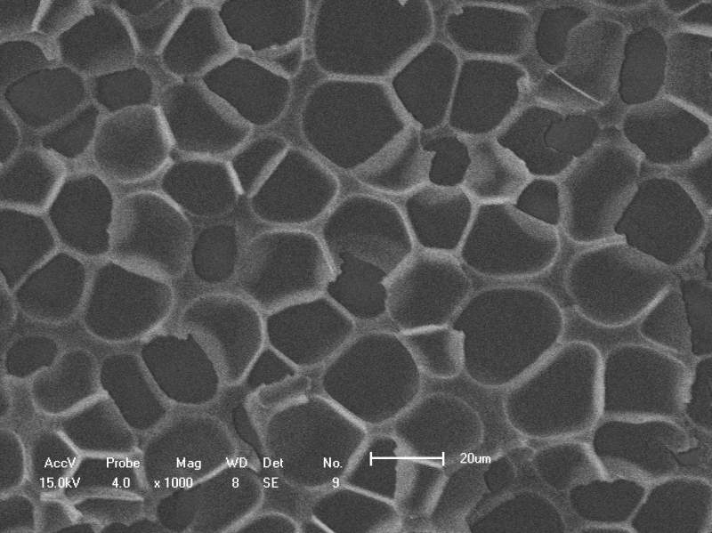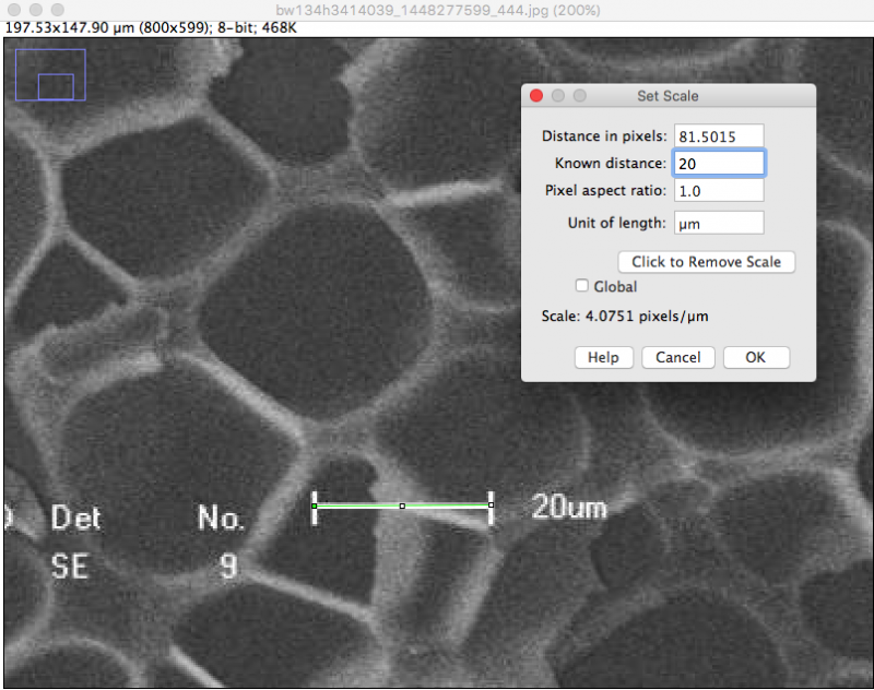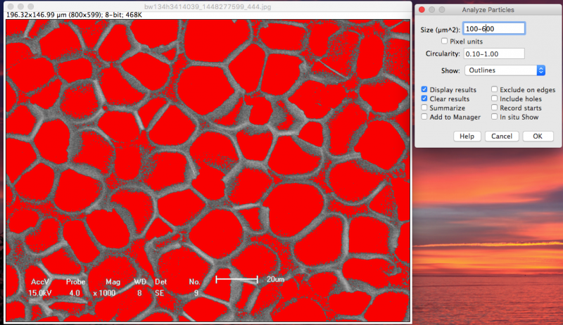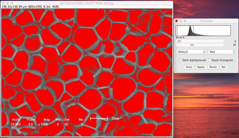1) Set scale. Enlarge your image, draw a line of the exactly same length to the scale bar. For you image, 81.5 pixel = 20 um) 2) Adjust threshold, which showed reasonable segmentations. 3) Analysis Particles. Based on the visional pore sizes, I would say areas between 100 um^2 and 600 um^2 should be the correct pores. 4) Copy the results into the Excel to calculate the average and the stDev. The 45 pores were detected out. The pore perimeter is 25.6 +/- 9.8 um. Some pore might be missed due to either the irregular shapes or the low image contrasts (not good segmentations) Cheers! |