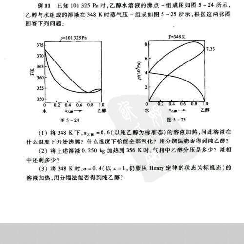 书中解析没看明白?其意思是若乙醇在全部浓度范围遵循亨利定律的话。经过处理乙醇在液相中含量可达90%,已介于恒沸混合物和纯乙醇之间,这样的话,通过蒸馏,自然可以得到纯的乙醇。但实际情况是不能做到的。...