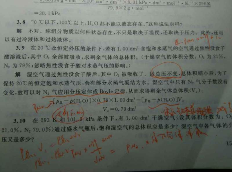 如题,3.9,实在是算晕过去了,按答案所给,左边应该是未吸收前关于氮气pv计算,右边是吸收后氮气pv计算。 0.79*1.00应该是氮气分体积,那么前面的p总-p水代表的是什么? 或者说未吸收前氮气分压不应该是总压强减去水分压与氧分压么,这里氧分压去哪了? 求解答 发自小木虫Android客户端 |