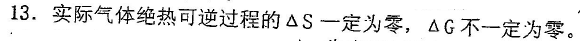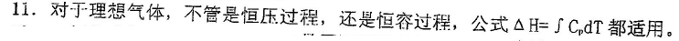 11、对。因为理想气体的焓只是温度的函数,只要始终态温度相同,其变化量是相同的,与恒容或恒压无关。 7、对。溶液是混合物,其浓度不同,开始析出固体溶剂的温度不同,即使外压相同。 10、对。在双相区因为物系点与相点分离,物系点只是表示物系总组成的,而表示体系实际存在的具体相态的相点在相线上。 13、错。实际气体的绝热可逆膨胀过程熵变一定为零,焓变一定小于零,吉布斯自由能变一定小于零 18、错。标准电极是人为规定的。有不同的分级,例如甘汞电极为二级标准电极,一般情况而言标准电极就是指标准氢电极。 |