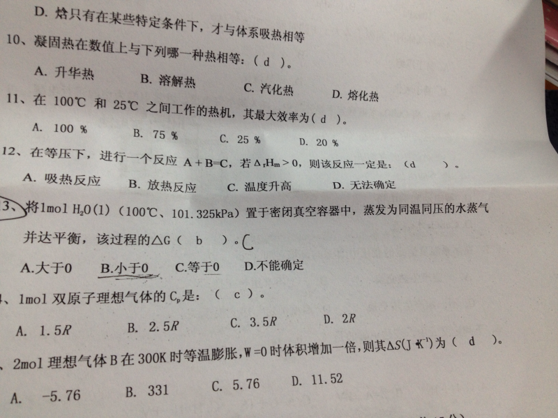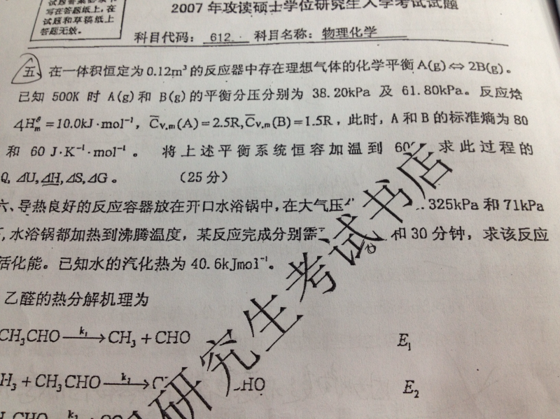 五 (1)利用平衡数据计算平衡常数,求得500K时的ΔrG°m,再结合已知ΔrH°m,求得ΔrS°m ΔrU°m, (2)利用基尔霍夫定律,根据ΔCp,计算600K时的ΔrH°m,ΔrS°m,ΔrG°m、ΔrU°m (3)利用600K和500K的ΔrH°m,ΔrS°m,ΔrG°m,ΔrU°m的数据,计算差值就是题中的ΔH,ΔS,ΔG、ΔU (4)此过程为等容过程Q=ΔU |