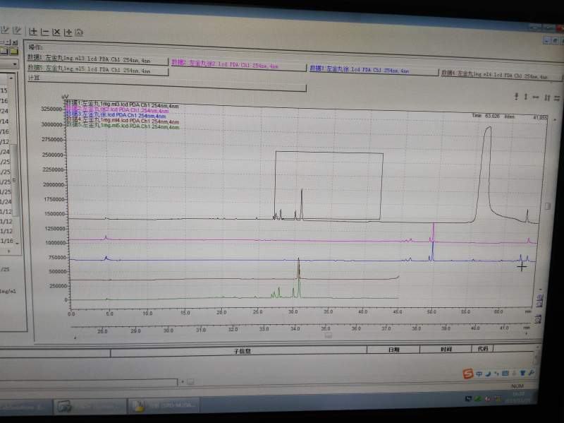 现在跑一个药物的指纹图谱,流动相乙腈,水,开始还可以,可是修改了一下时间条件,就变成了第一条图谱那样的,最后有一个大峰,流动相,机器,和样品都有换过,柱子清洗了四个小时,还是有大峰,后来又改回了初始条件,还是有最后的大峰,这是为什么? IMG_20151125_163630.jpg |