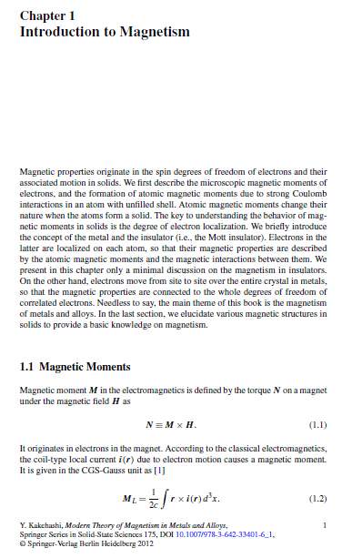 Modern Theory of Magnetism in Metals and Alloys Authors: Yoshiro Kakehashi ISBN: 978-3-642-33400-9 (Print) 978-3-642-33401-6 (Online) |