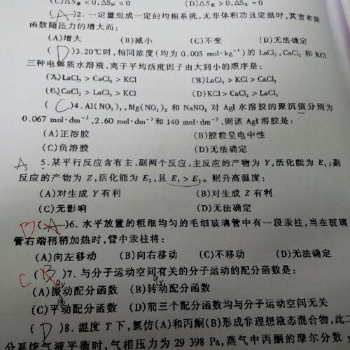 5、选A。升高温度有利于活化能高的反应。因为升高温度活化能高的反应速率系数随温度的变化率大。