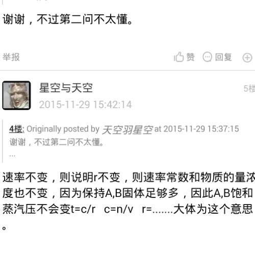 速率不变,则说明r不变,则速率常数和物质的量浓度也不变,因为保持A,B固体足够多,因此A,B饱和蒸汽压不会变t=c/r c=n/v r=.......大体为这个意思。 发自小木虫Android客户端 |