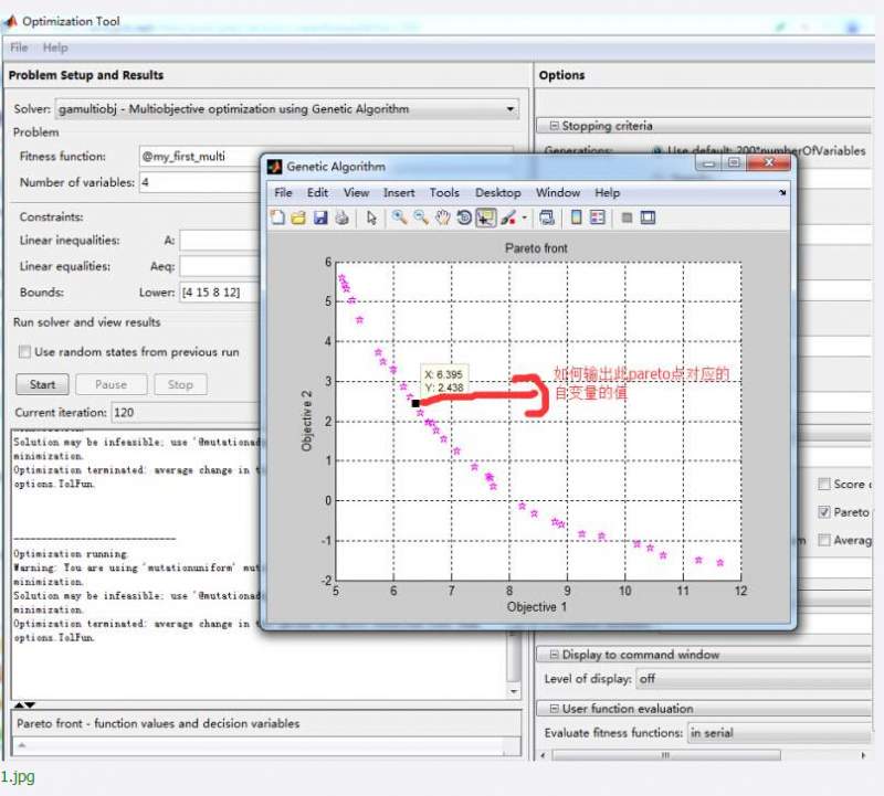 matlab中的gamultiobj工具箱求解获得pareto值时,如何输出对应点自变量的值。