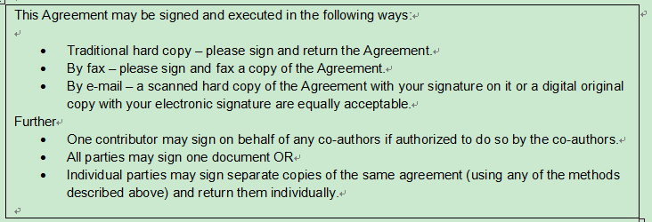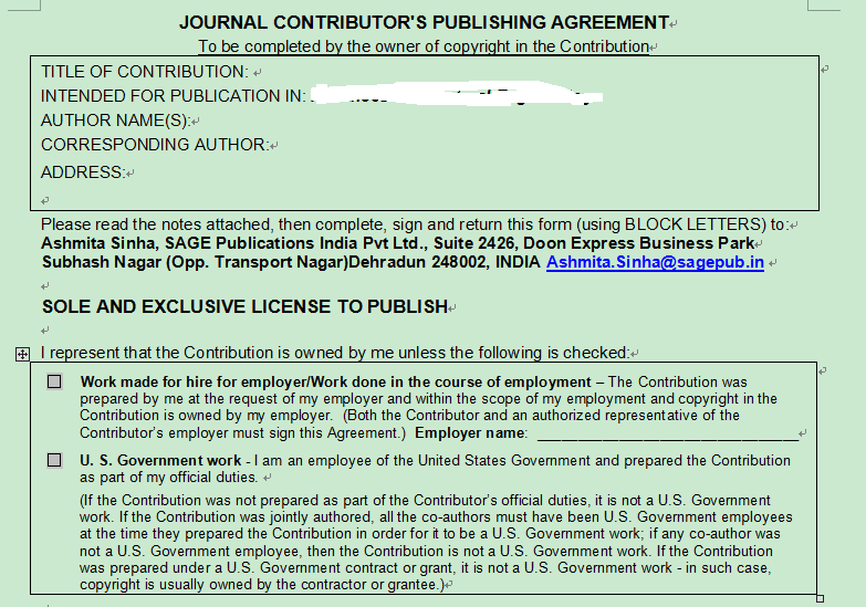 几个问题(1)签名几项TITLE OF CONTRIBUTION: INTENDED FOR PUBLICATION IN: AUTHOR NAME(S): CORRESPONDING AUTHOR: ADDRESS: 是不是在电脑上直接写上就行了啊 (2)I represent that the Contribution is owned by me unless the following is checked: 这句话下面是两个方框,是不是要选择一个,然后“Employer name:”这个怎写啊 (3)最后“Contributor” "Authorised Representative of Employer (if Work made for hire/done in the course of employment box is checked)" 这两项是不是也要选择一个签,怎么选呢 (4)这个期刊是不收版面费的 但是不知道还要不要选什么呢 不明白 (5)怎么发过去啊。签个名字弄成照片贴到这上面,发邮件过去行吗?还是打印出来签名,然后扫描一下发过去? 还有这句话 Please read the notes attached, then complete, sign and return this form (using BLOCK LETTERS) to: Ashmita Sinha, SAGE Publications India Pvt Ltd., Suite 2426, Doon Express Business Park Subhash Nagar (Opp. Transport Nagar)Dehradun 248002, INDIA Ashmita.Sinha@sagepub.in 什么意思啊,是所有的签名都是大写字母?? (详见图片) 2.png 3.png 1.png [ Last edited by kpingping on 2015-11-30 at 00:37 ] |