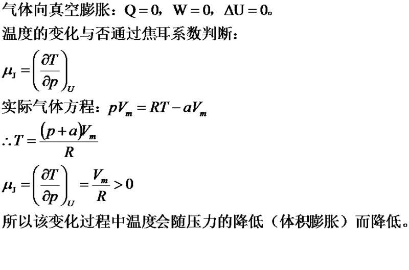 理解焦耳系数的意义,因为Vm>0.R>0,Vm/R>0。也就是说焦耳系数大于零,压力增大时,温度升高。此过程压力降低,自然温度也降低。...