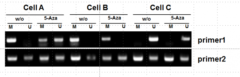 最近在做甲基化特异性PCR 材料是黑色素瘤细胞系提取DNA 样本组分别问 对照组 或者甲基转移酶抑制剂四天处理组 引物和PCR 条件均为文献报道 可是总是在对照组细胞中 均能够检测到甲基化条带 和未甲基化条带 请教高手 如何解决这个问题, CONTROL 组出现未甲基化的条带的原因是什么呢 PCR产物为非特异性扩增条带吗? 谢谢大家的帮助! 甲基化PCR.png |