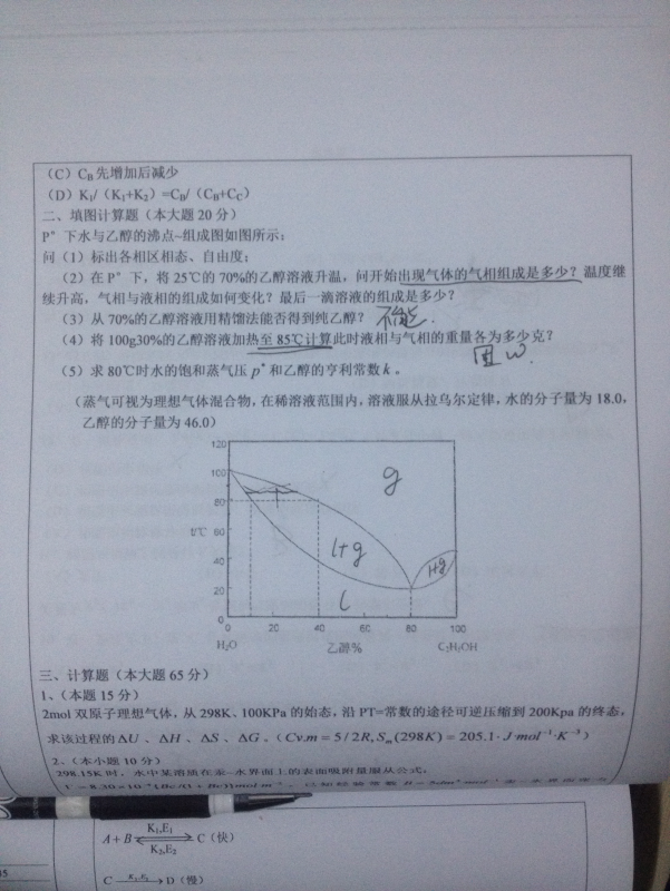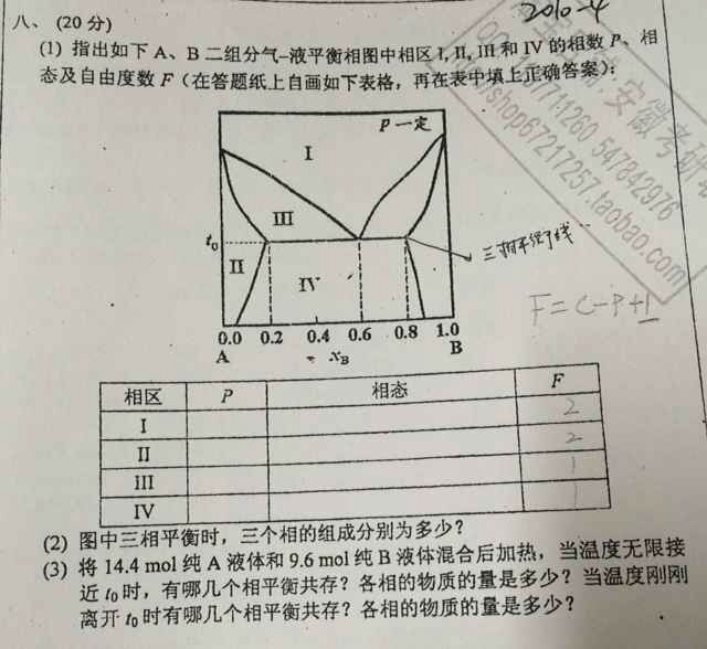 8.3、混合物组成X(B)=9.6/(9.6+14.4)=0.4 (1)当无限接近t0时,有三相共存,其中有X(B)=0.2和X(B)=0.8的共轭溶液,及X(B)=0.60气相。 X(B)=0.2的溶液16mol;X(B)=0.8的溶液8mol,X(B)=0.60气相为一小气泡。 (2)当刚离开t0时,也有三相共存,其中有X(B)=0.2和X(B)=0.8的共轭溶液,及X(B)=0.60气相。 X(B)=0.2的溶液12mol,X(B)=0.60气相 12mol,X(B)=0.8的溶液一个小液滴。 |