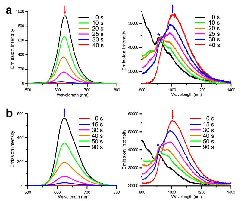 我的光谱测试时在FL910上做的。当时是做一个动态变化过程。本身的峰应该在1022nm处。过程中可见光区会出现一个峰,而近红外区的峰会消失。但是现在得结果是不管怎么做总会在920nm处出现一个小峰(打星号的位置)。这个峰是真实存在的还是由于仪器造成的呢? 发射光谱-ok.jpg |