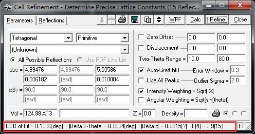 采用Jade晶胞参数精修(Cell Refinement),Refine之后会出来esd,这个是标准偏差我知道,还有平均Delta2-Theta,平均Delta-d值,Smith-Snyder品质因数F(n),这些值是什么意思呢,F是越大越好还是越小越好?这些值在多少范围内结果可以接受呢? CellRefinement.png |