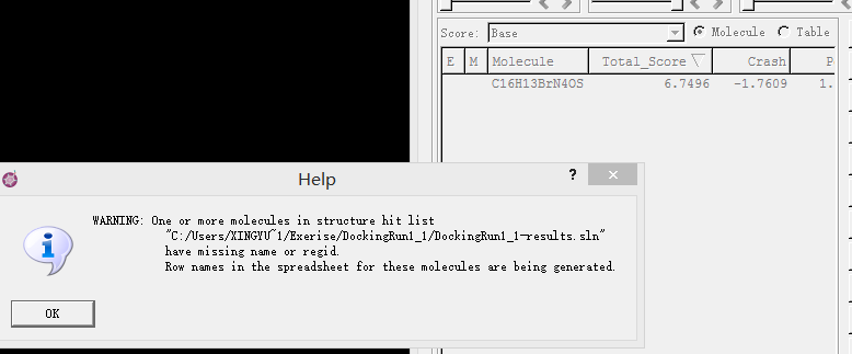 请教各位: 把自己画的分子结构(与原配体结构类似)对接,看对接结果时出现如图所示警告,点击"Molecule"看配体结构时,出现“Warning: Unable to identify molecule row number..."。请问是什么原因呀,如何处理呢,谢谢大家。 3.png |
